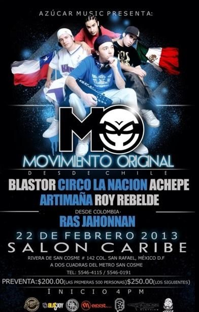 Movimiento Original agrupacion chilena visita una vez mas la Ciudad de México trayedo consigo su combinacion de reggae y hip-hop, esta ocasion se estaran presentando en el "Salon Caribe" el Viernes 22 de Febrero junto al colombiano Ras Jahonnan y artistas nacionales de reggae y hip hop como: Blastor, Achepe, Circo La Nacion, Artimaña y Roy Rebelde...